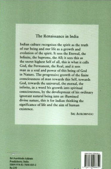 In this soft-cover book of 450 pages, Sri Aurobindo from Sri Aurobindo Ashram, Pondicherry, explains in his first essay that a renaissance in India means first the recovery of the past spiritual knowledge and experience in all its fullness, then the outpouring of this spirituality into new forms in all aspects of the country's life, and lastly, an original grasp of modern problems from an Indian temperament and intellect. The second essay, "Indian Culture and External Influence," was written in 1919 in answer to a comment published in a Bengali journal on "The Renaissance in India" series.