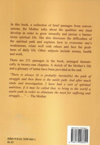 The Sunlit Path by The Mother of Sri Aurobindo Ashram, Pondicherry is a soft cover book of 250 pages. It is a collection of brief passages mostly from conversations with disciples and students at the Sri Aurobindo International Centre of Education.