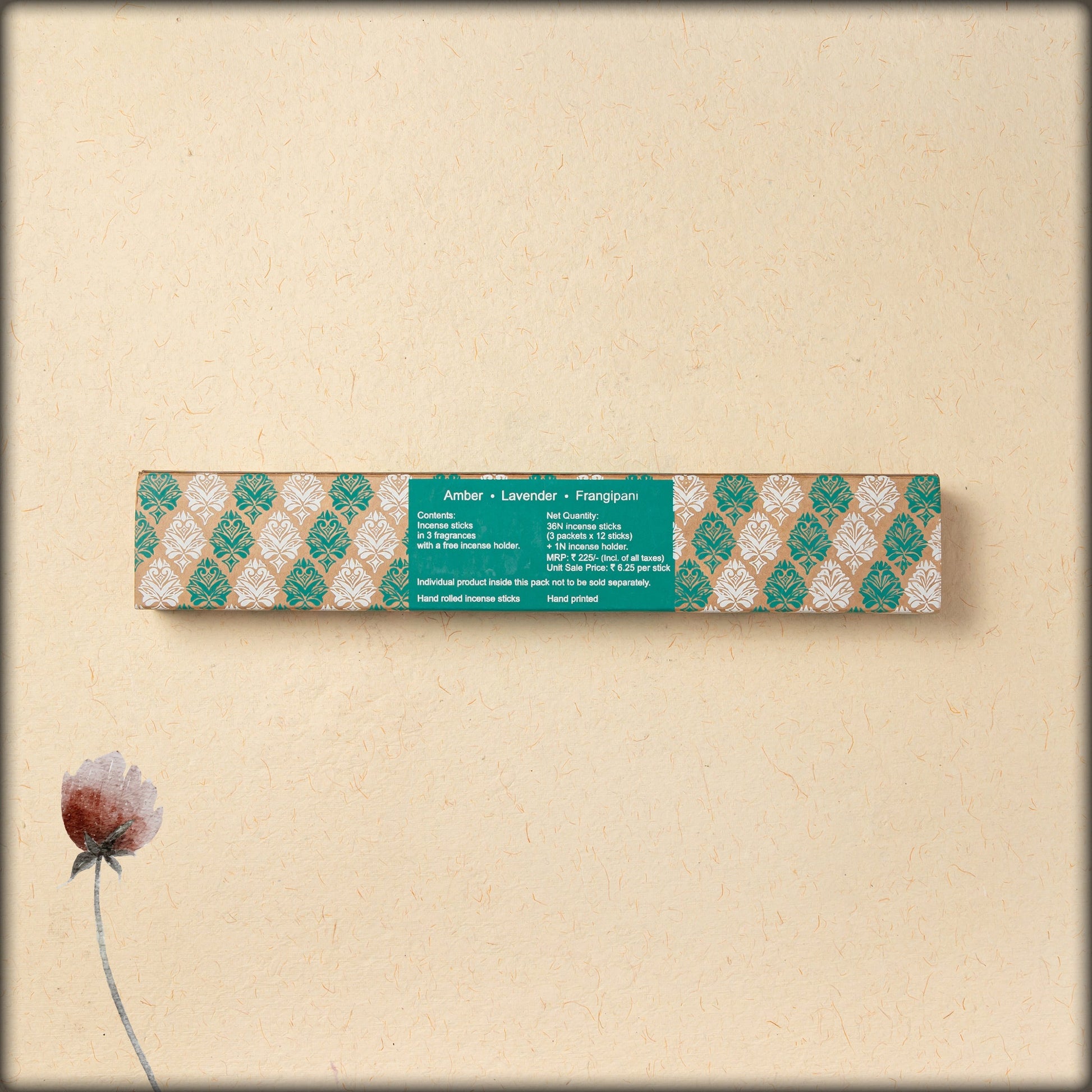 Hand-crafted with organic amber, lavender, frangipani, these incense sticks/agarbatti box offer a calming, toxin-free aroma perfect for meditation, relaxation, or daily rituals.