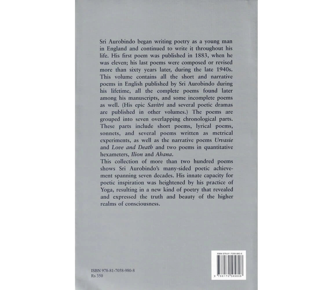 Sri Aurobindo from Sri Aurobindo Ashram, Pondicherry in his book Collected Poems showcases more than two hundred poems along with an essay "On Quantitative Metre", though his epic Savitri is not included.