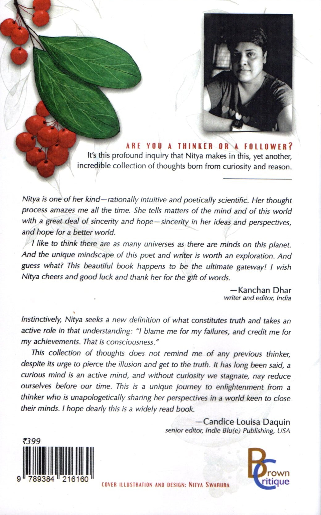 Curiosity Saves The Thinker is a soft-cover book of 170 pages by Nitya Swaruba. Unconditioned, unapologetic pieces of the mind. This collection of thoughts does not remind me of any previous thinker, despite its urge to pierce the illusion and get to the truth. It has long been said, a curious mind is an active mind, and without curiosity we stagnate, nay reduce ourselves before our time. this is a unique journey to enlightenment from a thinker who is unapologetically sharing her perspectives in a world keen to close their minds.