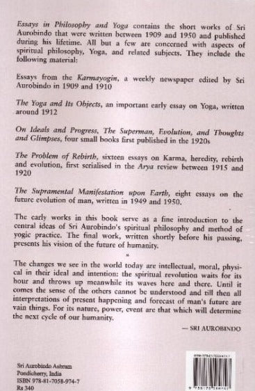 Arranged chronologically and by original place of publication, this soft-cover book of 604 pages begins with essays from the Karmayogin, followed by the early work. The Yoga and Its Objects. The third part contains writings from the Arya, including essays on Heraclitus, evolution, rebirth, karma and other pieces such as the summaries or "arguments" which preceded fifteen chapters of The Life Divine when it was originally serialised. The fourth part is a long essay published in 1920 in The Standard Bearer.