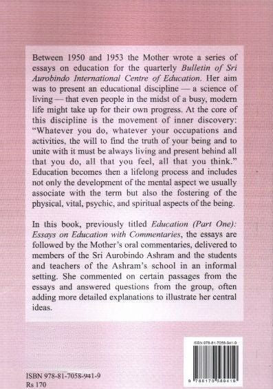 The second section contains her oral commentaries on these essays, delivered to Ashram members and the students and teachers of the Ashram school in an informal setting, where she commented on certain passages and answered questions from the group.