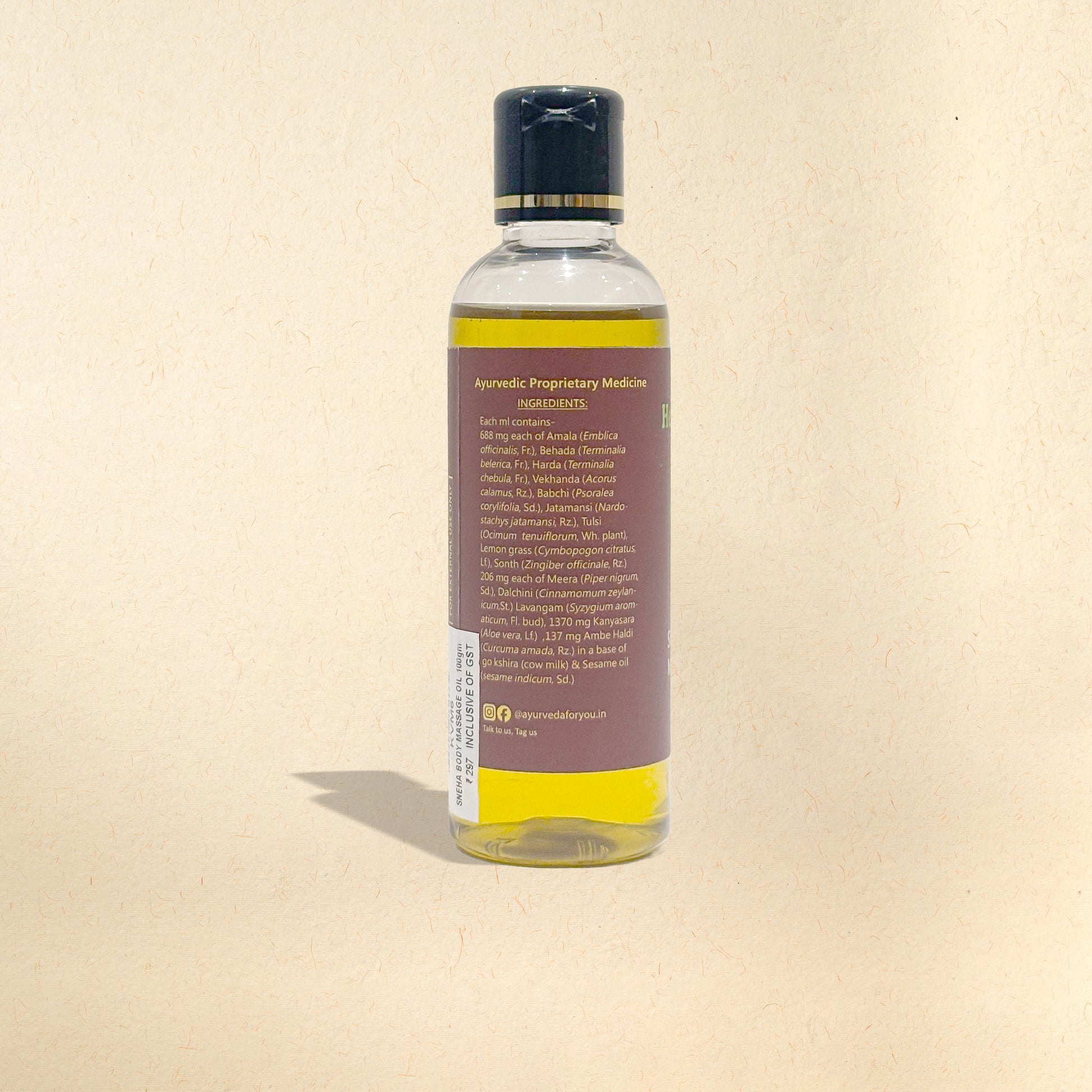 A traditional Ayurvedic blend of Amala, Harada and Behada for rejuvenation, Bala and Ashwagandha for strengthening and nourishment, Tulsi, Lemongrass and Ginger for warmth and stimulation, Turmeric and Aloe Vera for soothing care, all infused in a nourishing sesame oil and cow’s milk base for deep, restorative body massage.