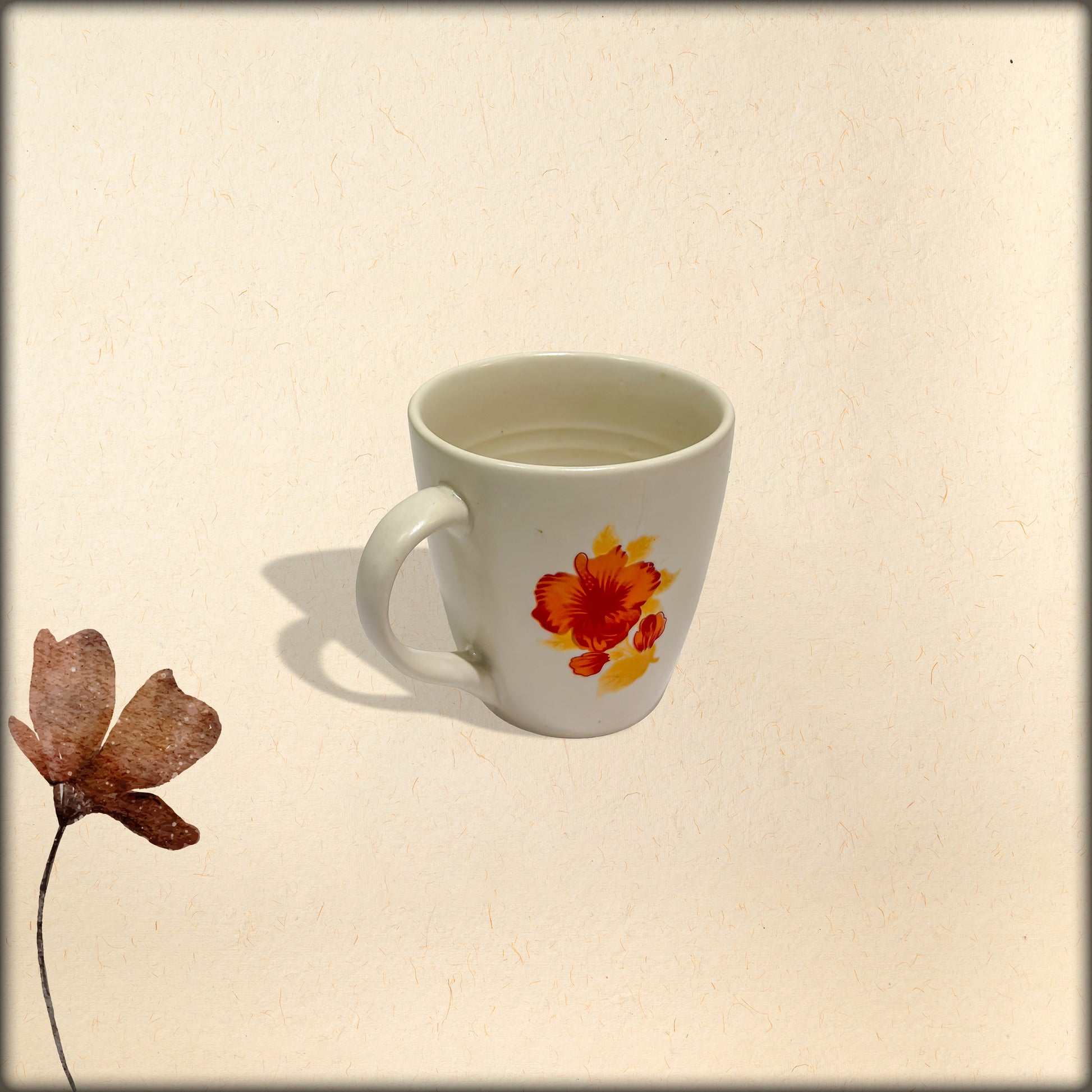 An ivory hibiscus mug crafted with delicate floral detailing. Lightweight, smooth, and comfortable to hold, it brings elegance to tea-time while adding a soft, decorative charm to your table.