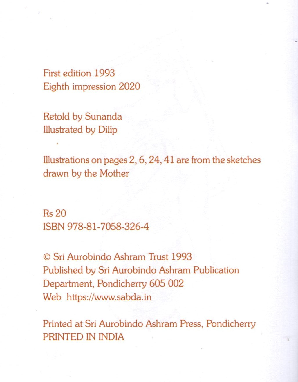 Stories for children about cats, based on the Mother's talks. Retold by Sunanda.