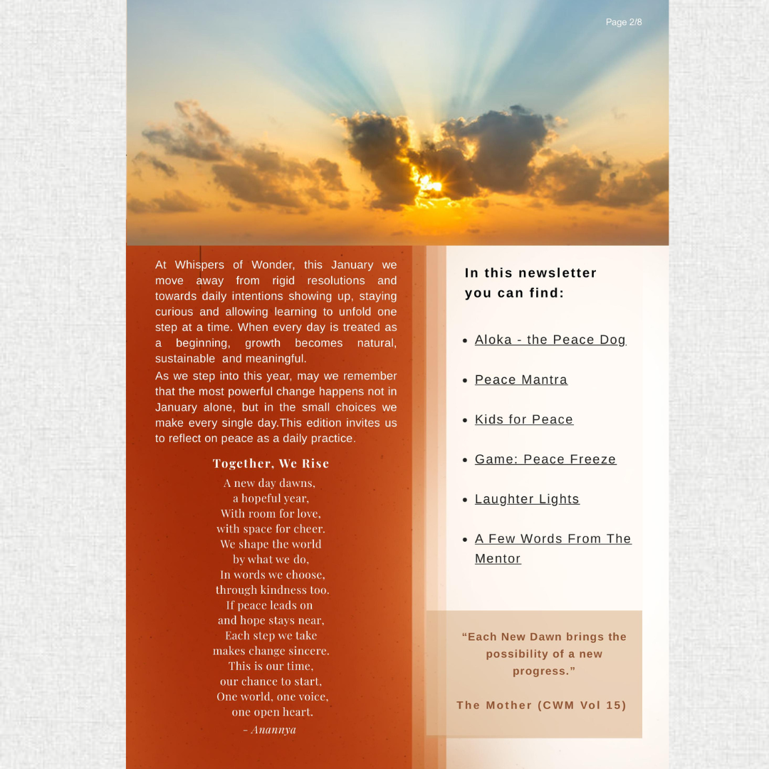 This January we move away from rigid resolutions and towards daily intentions, showing up, staying curious, and allowing learning to unfold one step at a time. When every day is treated as a beginning, growth becomes natural, sustainable, and meaningful. As we step into this year, may we remember that the most powerful change happens not in January alone, but in the small choices we make every single day. This edition invites us to reflect on peace as a daily practice.